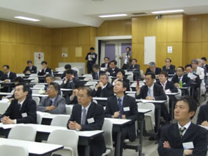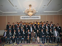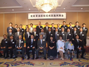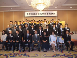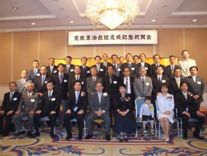 「楠水会」は、井前研究室、古賀研修室、荒木研究室、山西研究室の同窓会です。平成16年に佐賀市内で発会式を行い、3年毎に開催することとしております。卒業生、現役の学生を含め総勢55名の参加で、久しぶりに会う同級生や、先輩、後輩達と時間が経っても変わらぬ親交を深め、先生方からも変わらぬ叱咤激励(?)をいただきました。平成4年の卒業生からは、昨年還暦を迎えられた古賀先生に赤いチャンチャンコと高級焼酎のプレゼントというサプライズも。「先生に会わせたい」と赤ちゃんを連れて参加してくれた卒業生と、まるで親子3代のように写真に納まる先生方の姿も見られ、大いに盛り上がりました。