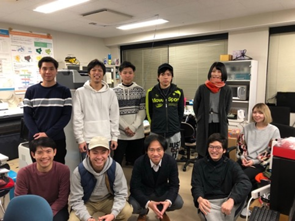 今回末次研究室の紹介をさせて頂くことを嬉しく思います。現在末次研究室は末次大輔准教授、修士2年1名、修士1年1名、学部4年5名の計8名で活動しています。メンバーは全員男で花のない研究室ではありますが、男だけでしかできない会話をして日々盛り上がっております。