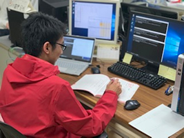 現在研究室では、修士論文・卒業論文の作成が佳境に入ってきており、大変忙しい日々を送っています。私も今年度で卒業するため、毎日膨大なデータと格闘しています。時には「きついなぁ」と思うこともありますが、そのようなときには同じ研究室の仲間と一緒に食事したり、話したりして息抜きができるため、とても楽しく充実した時間を過ごすことができています。